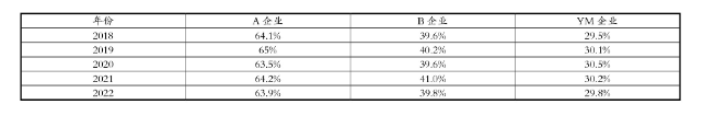 表1 A企業(yè)與B企業(yè)、YM企業(yè)采購成本占營業(yè)收入比率